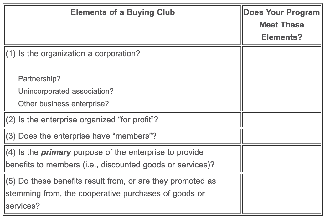 The absence of any one of these elements allows an organization to avoid buying club classification.
