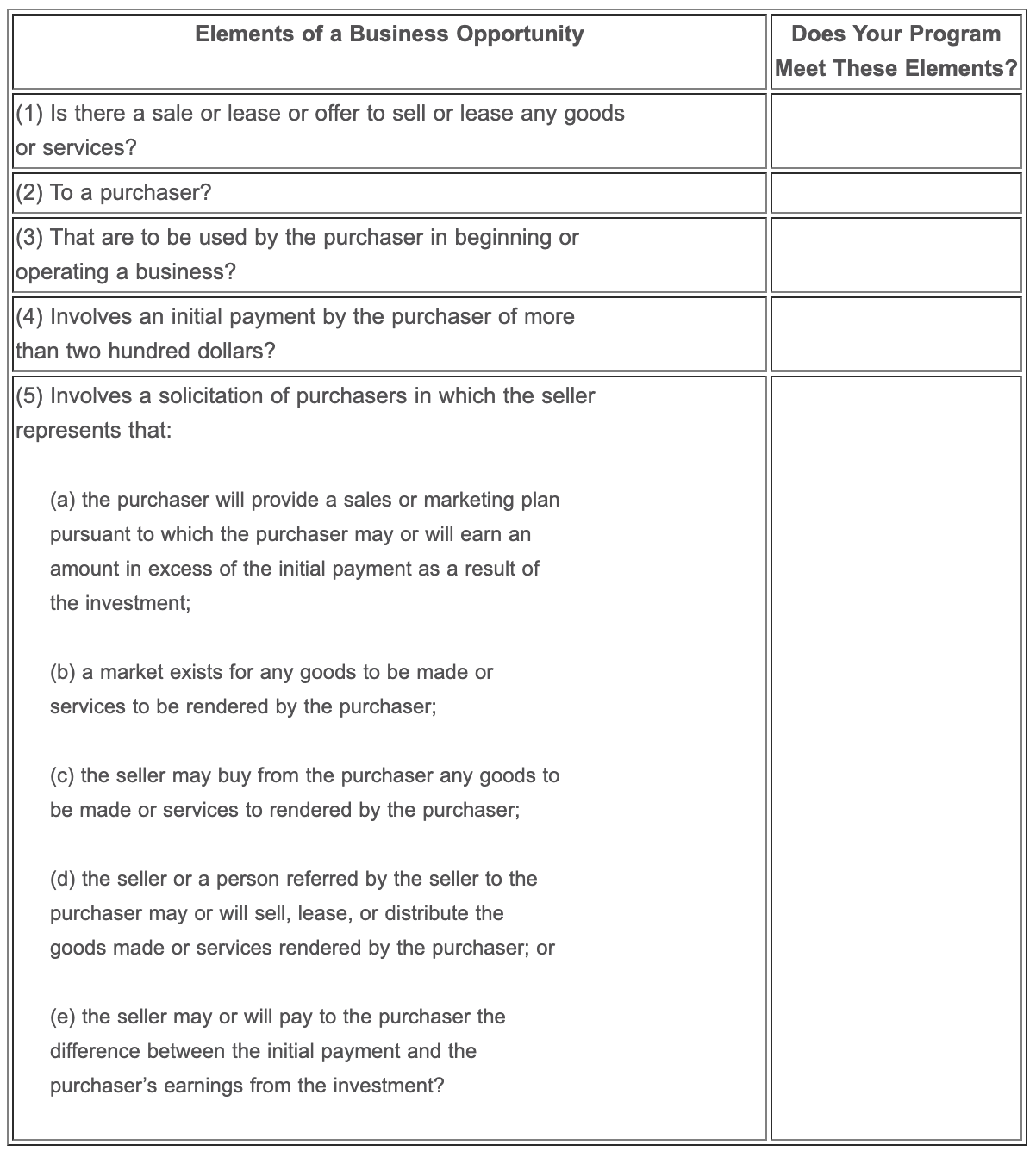 Like buying clubs, “business opportunities” are not illegal, however, they mandate compliance with a host of onerous regulatory requirements. The intent behind such legislation is to provide consumers certain protection from large investments for income producing opportunities. Historically, such “opportunities” have ranged from ostrich farms to vending machines businesses. The protection includes disclosure of information about the opportunity and its promoters, contract rescission rights, bonding, and state registration. As a practical matter, business opportunity statutes encompass most business activities for which the promoter asserts that a certain amount of income may be earned. A “business opportunity” is essentially defined as a sale or lease of any products, equipment, supplies or services for which the seller represents that: (1) the purchaser may or will derive income which exceeds the price paid for the opportunity; or (2) it will provide a sales or marketing program to enable the purchaser to derive income which exceeds the price paid for the opportunity.