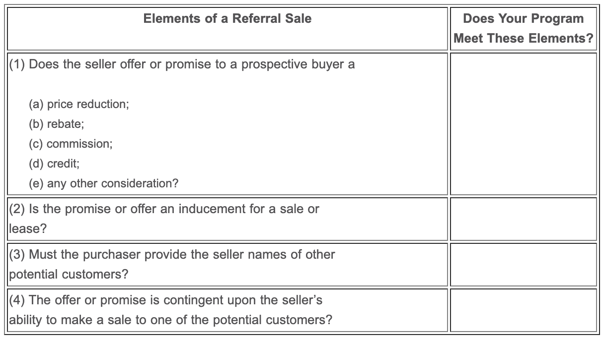 A “referral sale” is typically defined as the provision or offer to provide a customer a prize, discount, rebate, or other compensation as an inducement for a sale that requires the prospective customer to give names of other prospective customers to the seller, if earning the prize, discount, rebate, or other compensation is contingent upon a sale to one of the “referred” customers.(21) To the surprise of most people, particularly sales persons, referral sales are illegal throughout the United States.