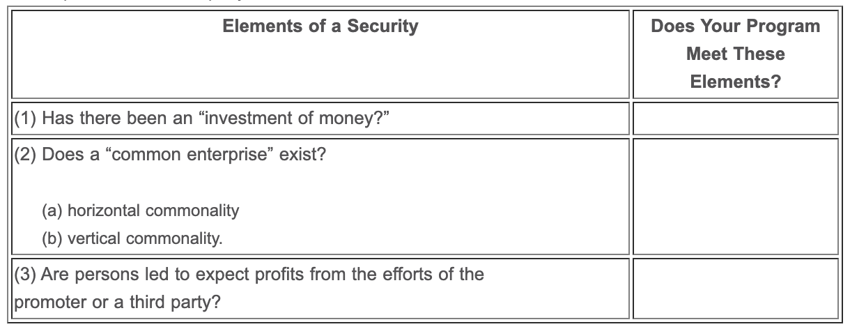 The Securities Act of 1933, the Securities and Exchange Act of 1934, and most state securities acts (Blue Sky laws) include the term “investment contract” within the definition of a security. None of these statutes, however, defines the term. Thus, the United States Supreme Court, in Securities & Exchange Commission v. W. J. Howey Company,(23) set forth the following three-prong test to determine if an instrument constitutes an investment contract: